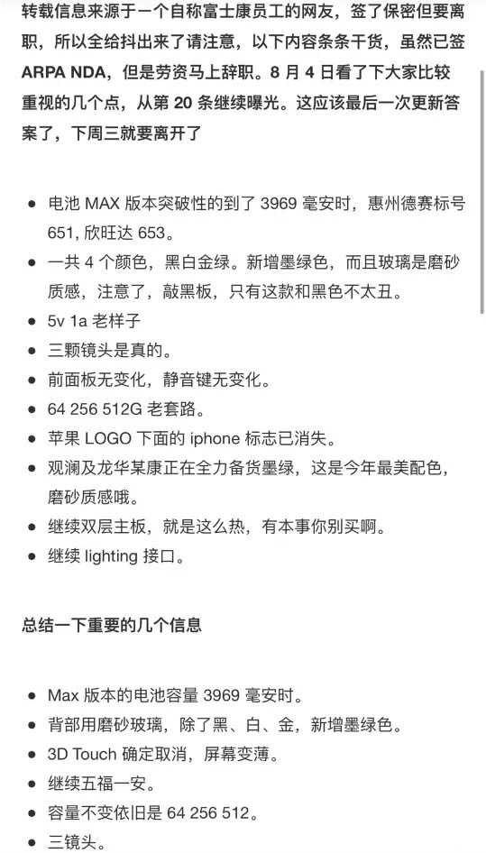 此前,依据一位自称为郑州富士康网民的信息,曝出了2020年新iPhone的干货知识。iPhone X1 Max电池电量为3963mAh、增加深绿色颜色(原谅绿??)、确定取消三维 Touch、再次9V1A慢充、及其选用集成浴霸三摄,最终则是撸羊毛式的64、256、512GB的存储量设定。