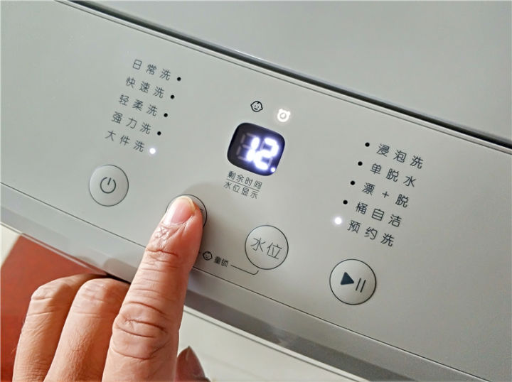操作区域有四颗组合按键,从左至右分别是开关机、洗涤程序、水位、启动/暂停按键,后三颗按键组合使用还能实现预约时间选择、开启关闭童锁功能,操作简单易上手,方便。